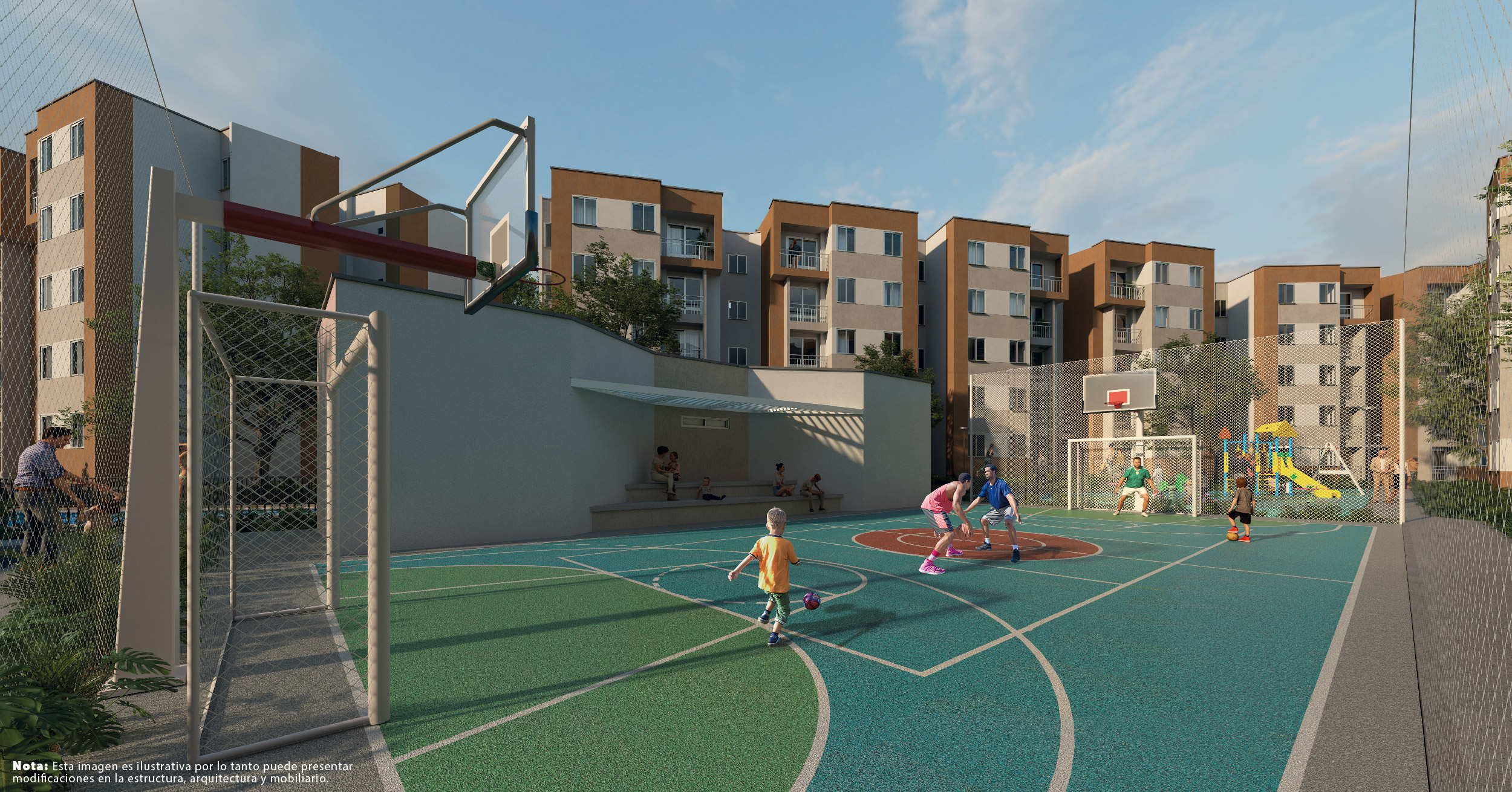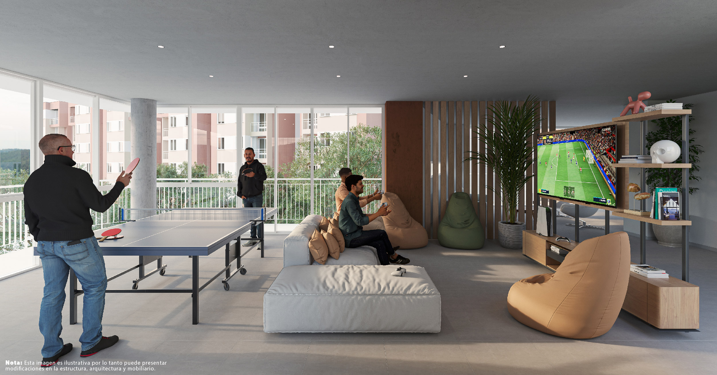 Entre sus zonas comunes se encuentra la cancha múltiple para practicar deporte al aire libre, el Coliving compuesto por una sala de entretenimiento, sala premium, sala de coworking, harán que tu vida sea placentera. Además, podrás disfrutar de los accesos a las zona húmeda compuesta por la piscina para adultos y piscina lúdica para los niños.