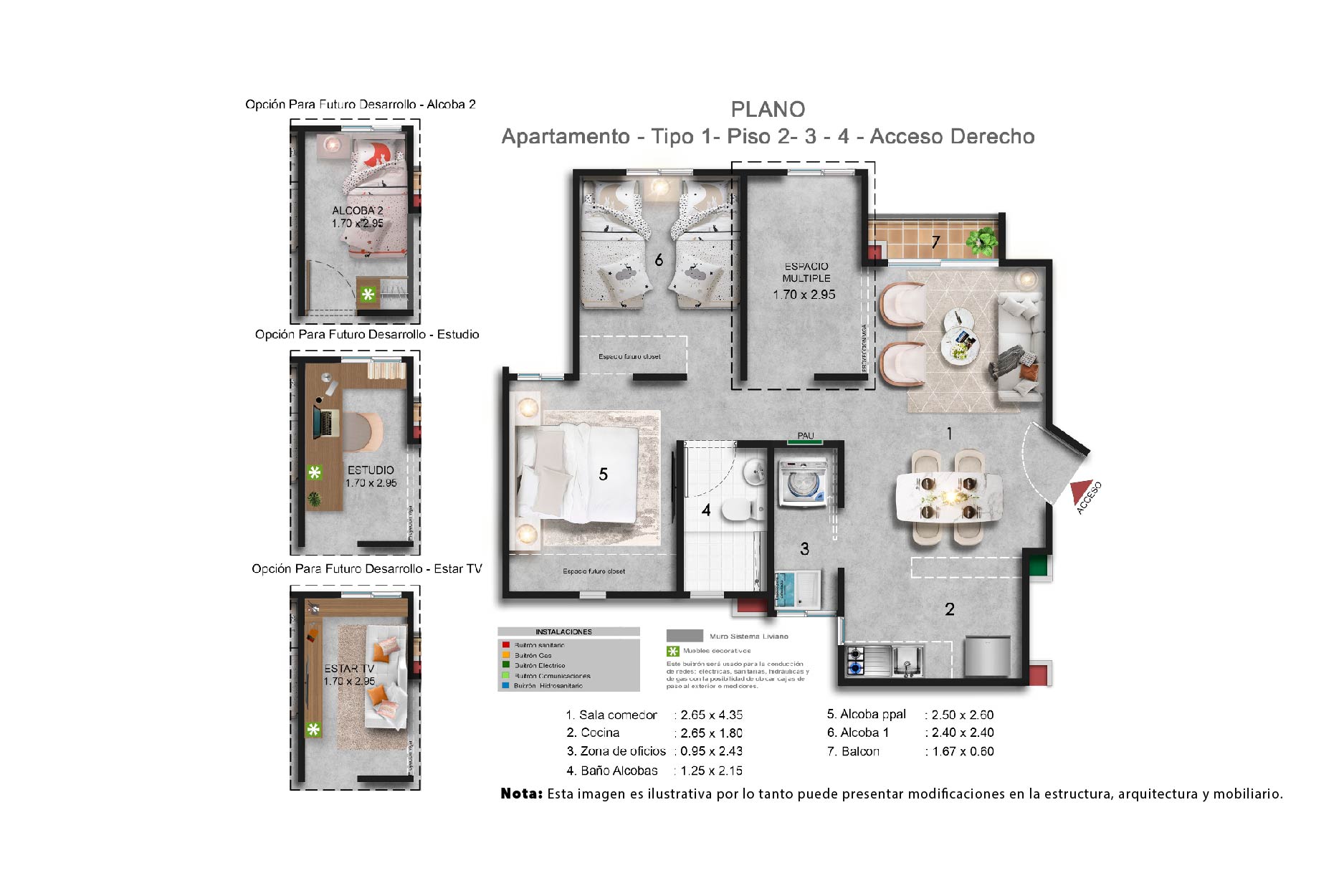 En este espacio contarás hasta con 3 alcobas dado su espacio múltiple que permite adaptarse en una tercera alcoba, estudio o sala de estar. Además tendrás zona de oficios independientes, baño social, cocina abierta que conecta a la sala-comedor y salida a su hermoso balcón, lo que permite luz natural y circulación del aire por todo el apartamento.