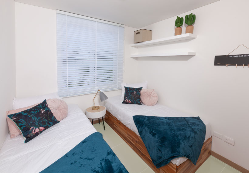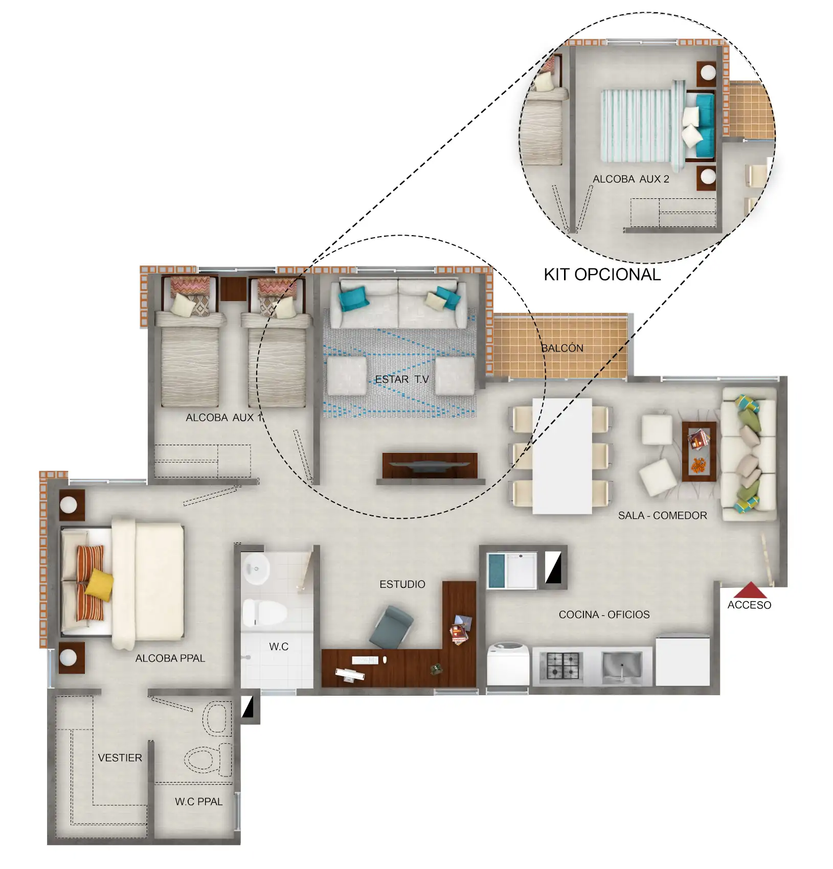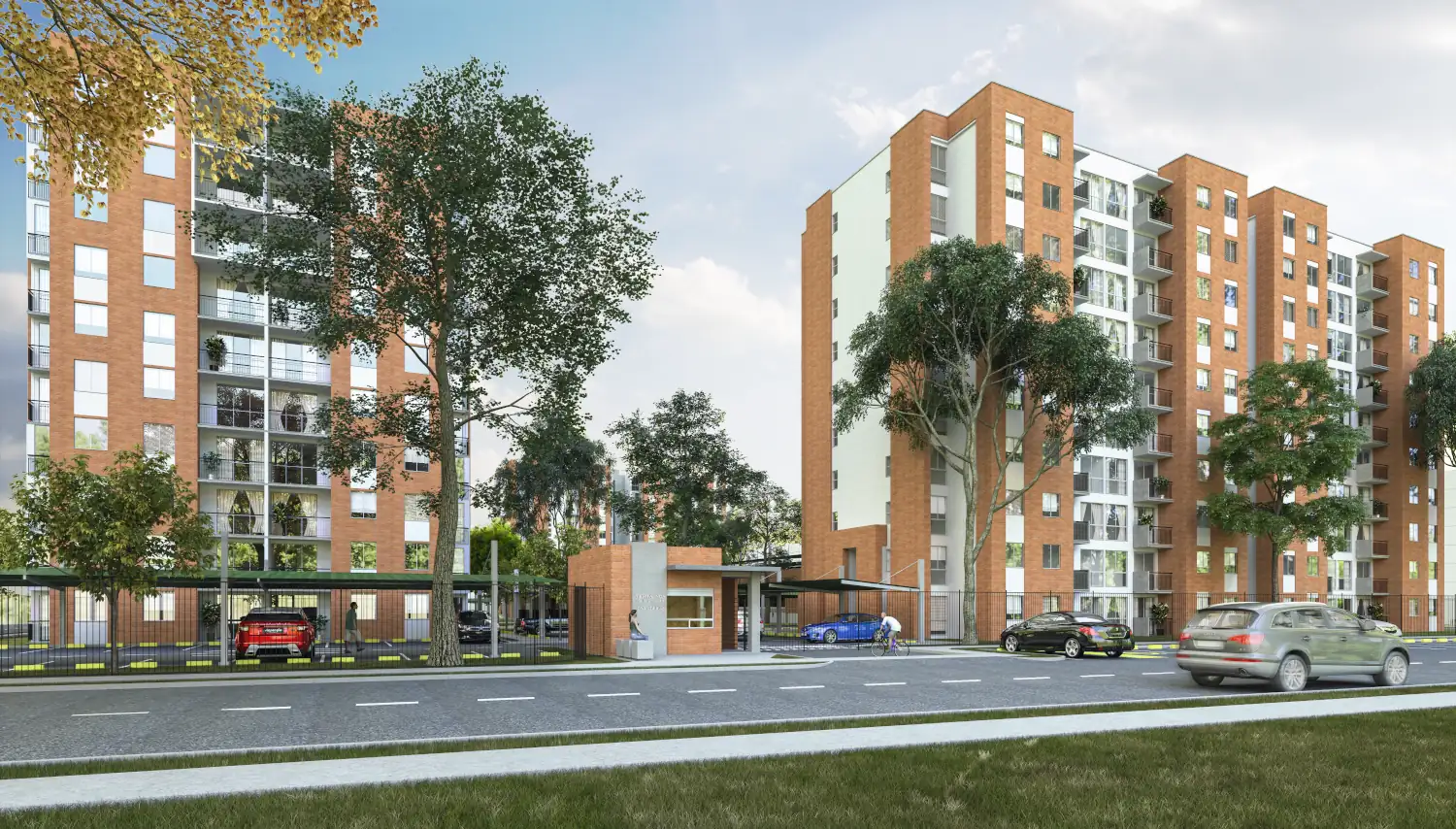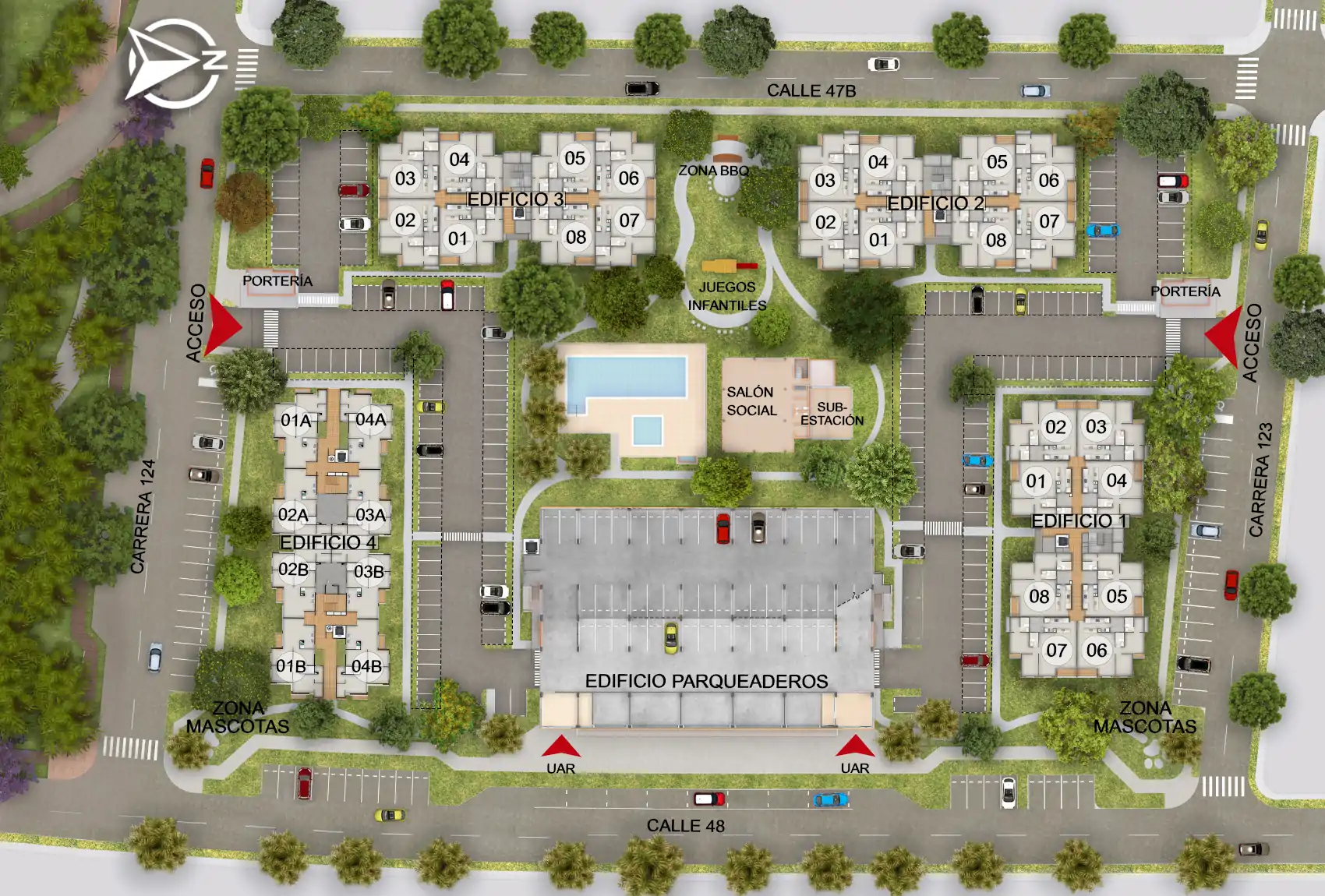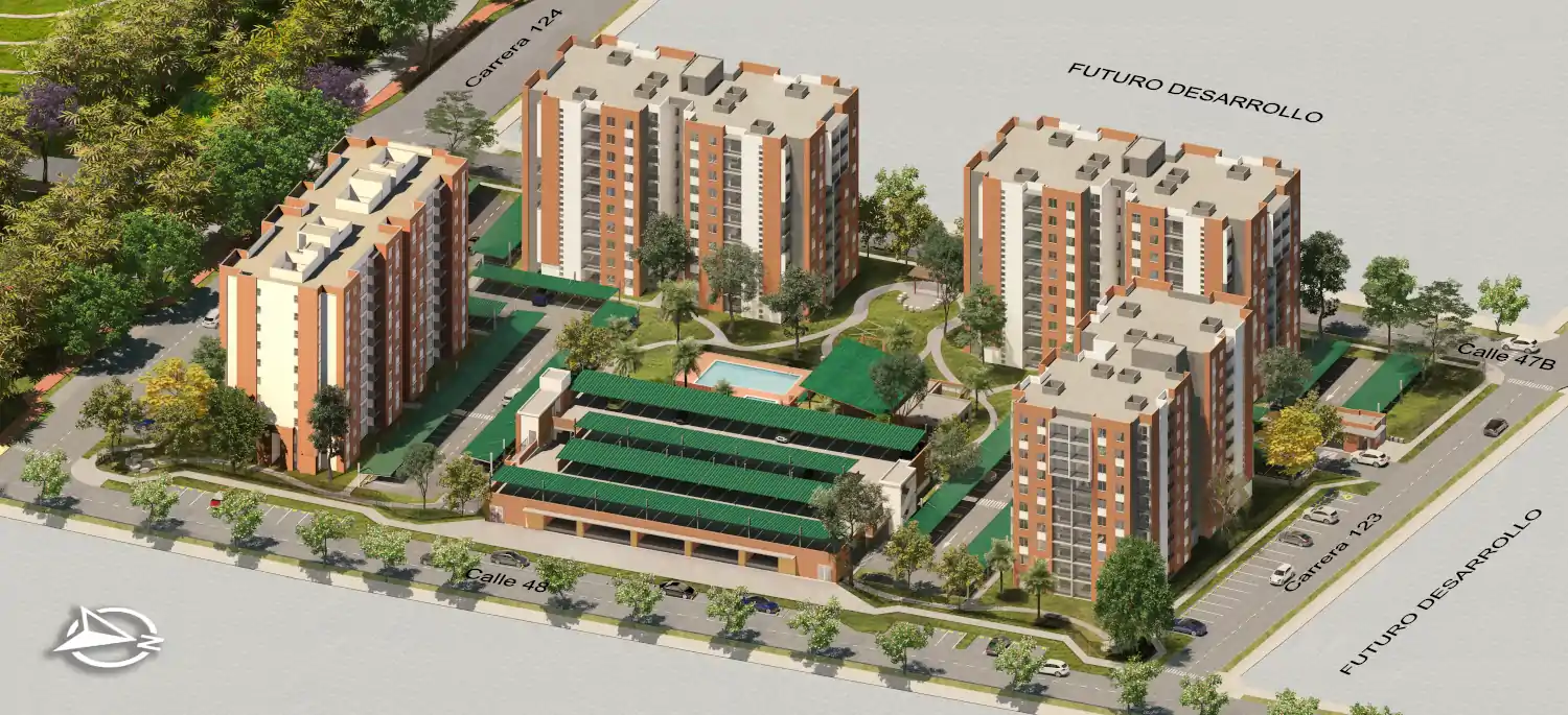 El proyecto dispone de dos accesos vehiculares sobre la Cra 123 y Cra 124, tiene 320 parqueaderos privados, distribuidos 161 en playa y 159 en edificio de parqueaderos; cada edificio de vivienda tiene una altura de 10 pisos y 8 aptos por piso, para un total de 320 apartamentos. Las zonas comunes cuenta con: piscina de adultos y niños, kiosko con espacio para administración, juegos infantiles, sub-estación eléctrica, zona para mascotas y zona BBQ.